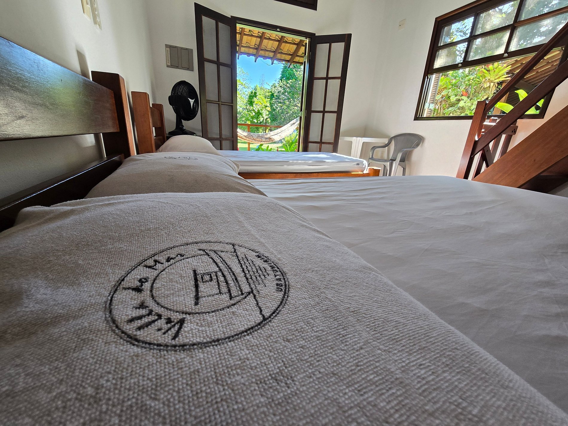 O chalé possui duas suítes que acomodam até 5 pessoas, cada suite tem 1 cama de solteiro e 1 de casal no térreo e 1 cama de casal no mezanino. No mezanino há uma sacada, na altura das copas das árvores, é um convite para observar a vida selvagem e se encantar com os pássaros da região. O chalé possui cozinha compacta e área externa anexa, com toldo retrátil, tanque de roupas e churrasqueira. A varanda com rede é o lugar ideal para relaxar após um dia de praia!